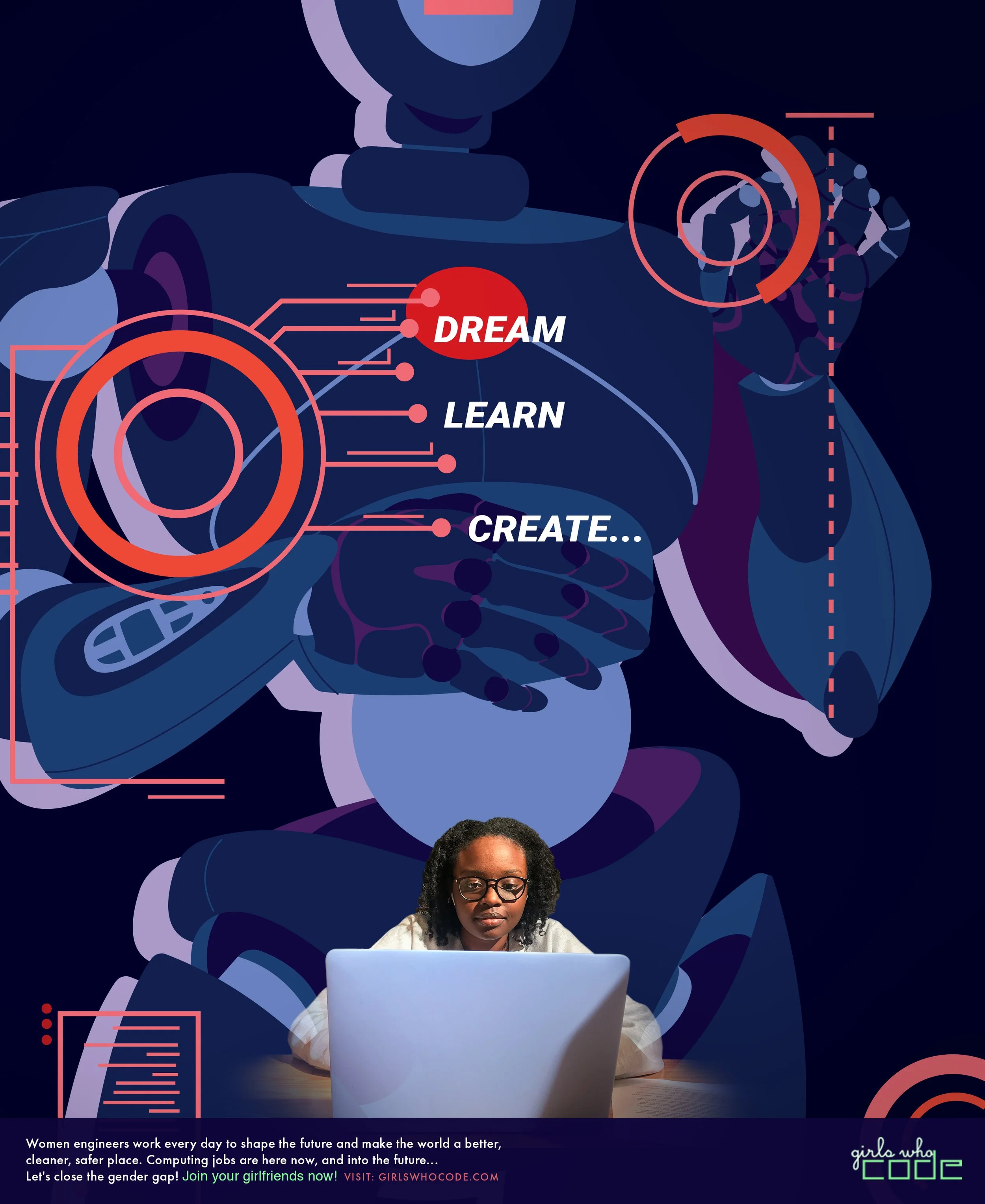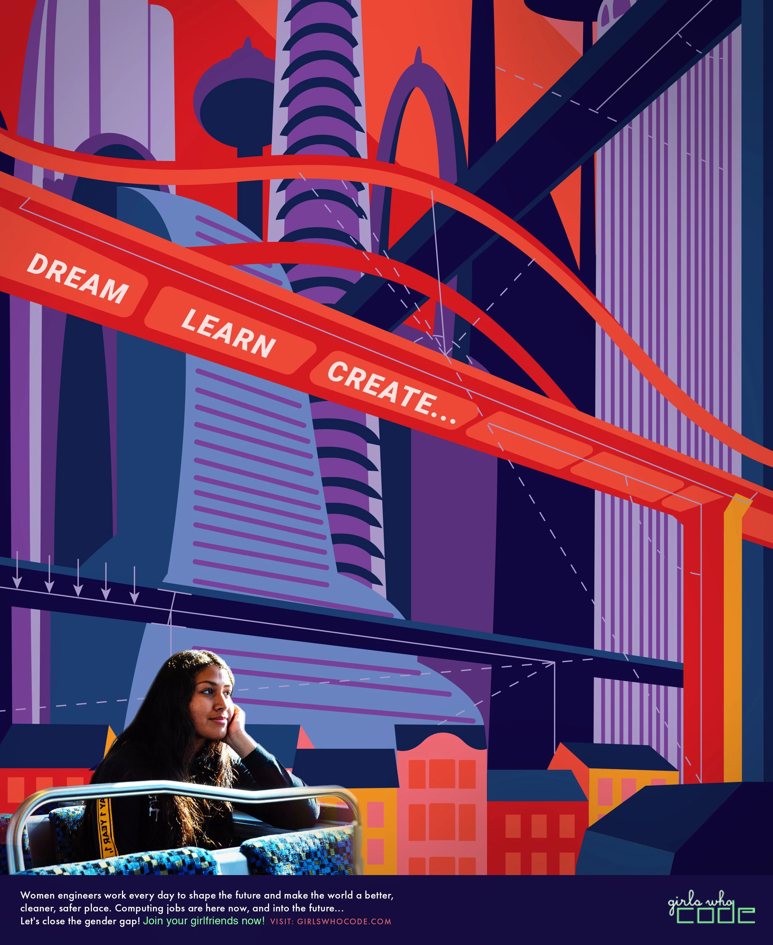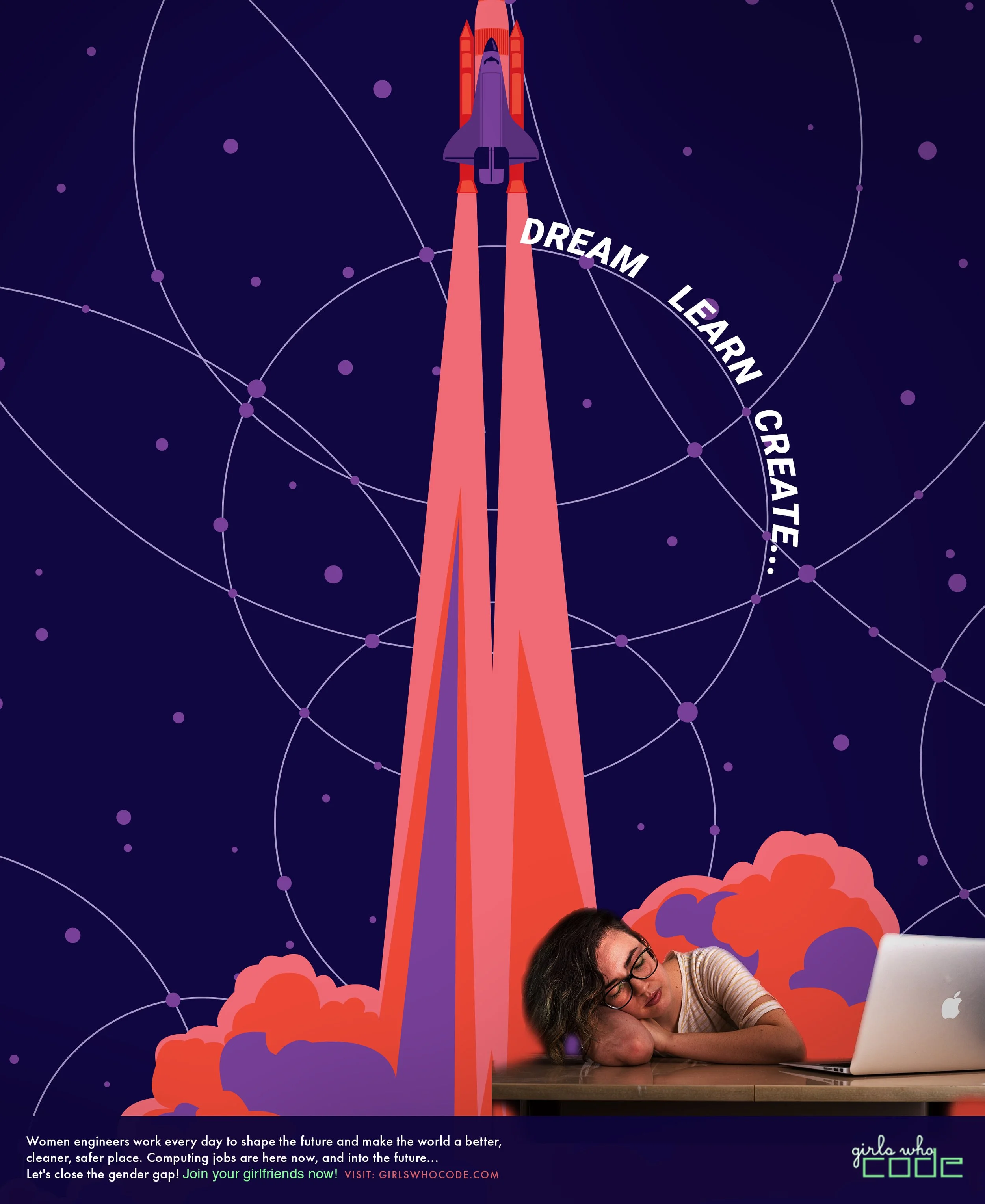 Girls Who Code is a free summer and after-school created to increase the amount of women in computer science. Our group decided to creatively show how Girls Who Code fosters imagination, equip students with knowledge, and how to use that knowledge to make their dreams a reality. Even though each background element is different and focuses on other aspects of computer science, the same style and color palette used through-out ties the series together.